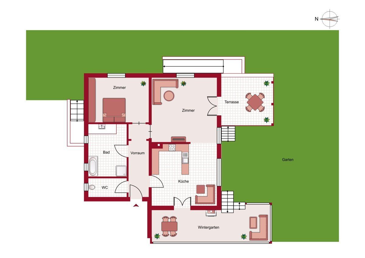 Die Räumlichkeiten verteilen sich auf ein Wohnzimmer, ein Schlafzimmer, eine Küche, einen Wintergarten, sowie ein Badezimmer mit Dusche und Badewanne. Abgerundet wird das Raumangebot mit einer Terrasse und einem großzügigen Garten. Im Jahr 2022 wurde die gesamte Wohnung liebevoll renoviert, wobei besonderes Augenmerk auf jedes Detail gelegt wurde.