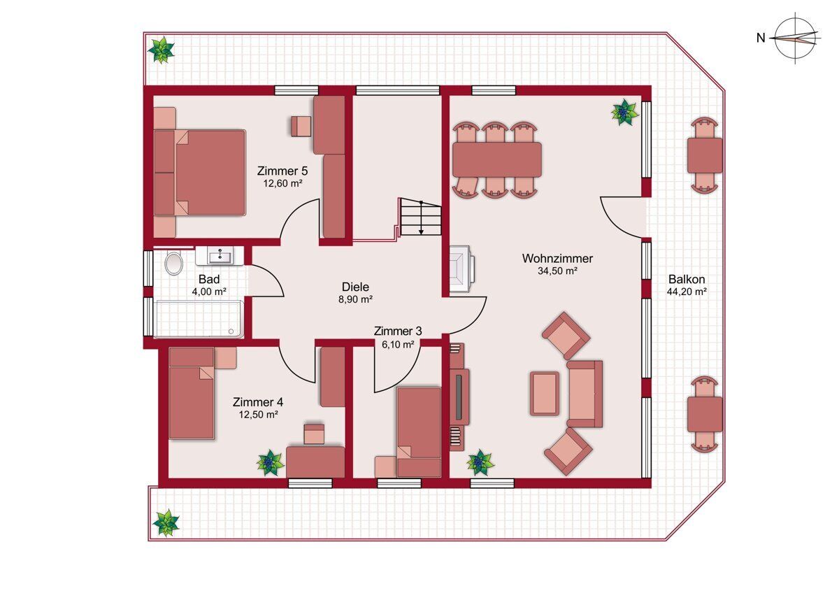 Der umlaufende Balkon mit Ausrichtung nach Osten, Süden und Westen bietet über den gesamten Tagesverlauf angenehme Sonnenstunden. Ergänzend dazu schließt eine Terrasse direkt an den Küchen- und Wohnbereich an. Die Gartenfläche von rund 205 m² bietet Platz für individuelle Gestaltungsmöglichkeiten und gemütliche Erholungsbereiche.