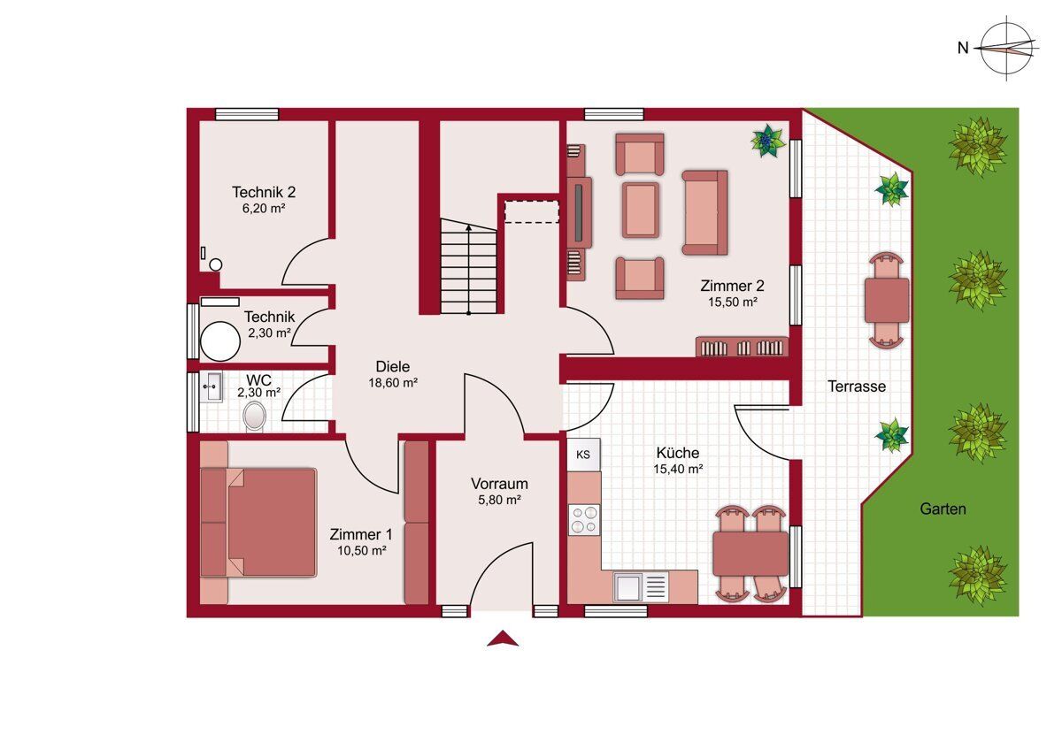 Im Erdgeschoss befindet sich ein separater Küchenraum mit allen notwendigen Anschlüssen sowie direktem Zugang zur Terrasse und in den Garten. Angrenzend liegt ein weiteres Zimmer, das sich ideal als Esszimmer oder Erweiterung des Wohnbereichs nutzen lässt. Eine Einbauküche ist derzeit nicht vorhanden, wodurch zukünftige Eigentümer volle Gestaltungsfreiheit haben. Ergänzend befinden sich auf dieser Ebene ein Vorraum, ein separates WC sowie zwei Technikräume – einer mit Boiler und einer mit Waschmaschinenanschluss.