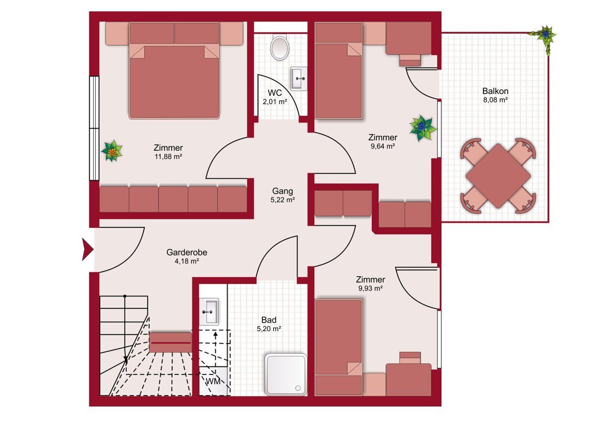 4-Zimmer-Maisonette-Wohnungen (93 - 109m²): Für Interessenten mit erhöhtem Platzbedarf und für all jene, die ein Reihenhaus-Flair über 2 Etagen, einem klassischen Grundriss vorziehen.