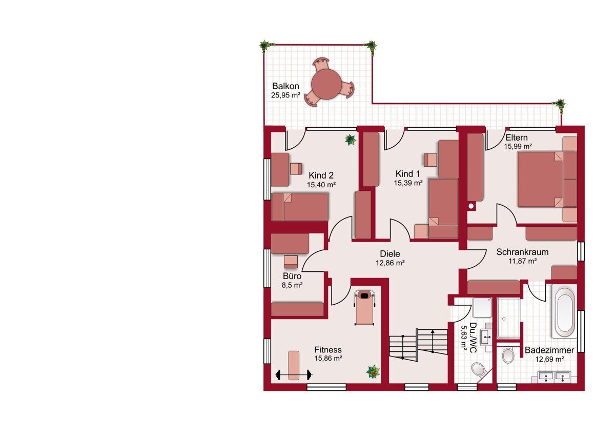 Das Obergeschoss bietet zwei Kinder- bzw. Gästezimmer mit Balkonzugang, Büro, Fitnessraum sowie einen exklusiven Masterbereich mit begehbarem Kleiderschrank und Badezimmer.