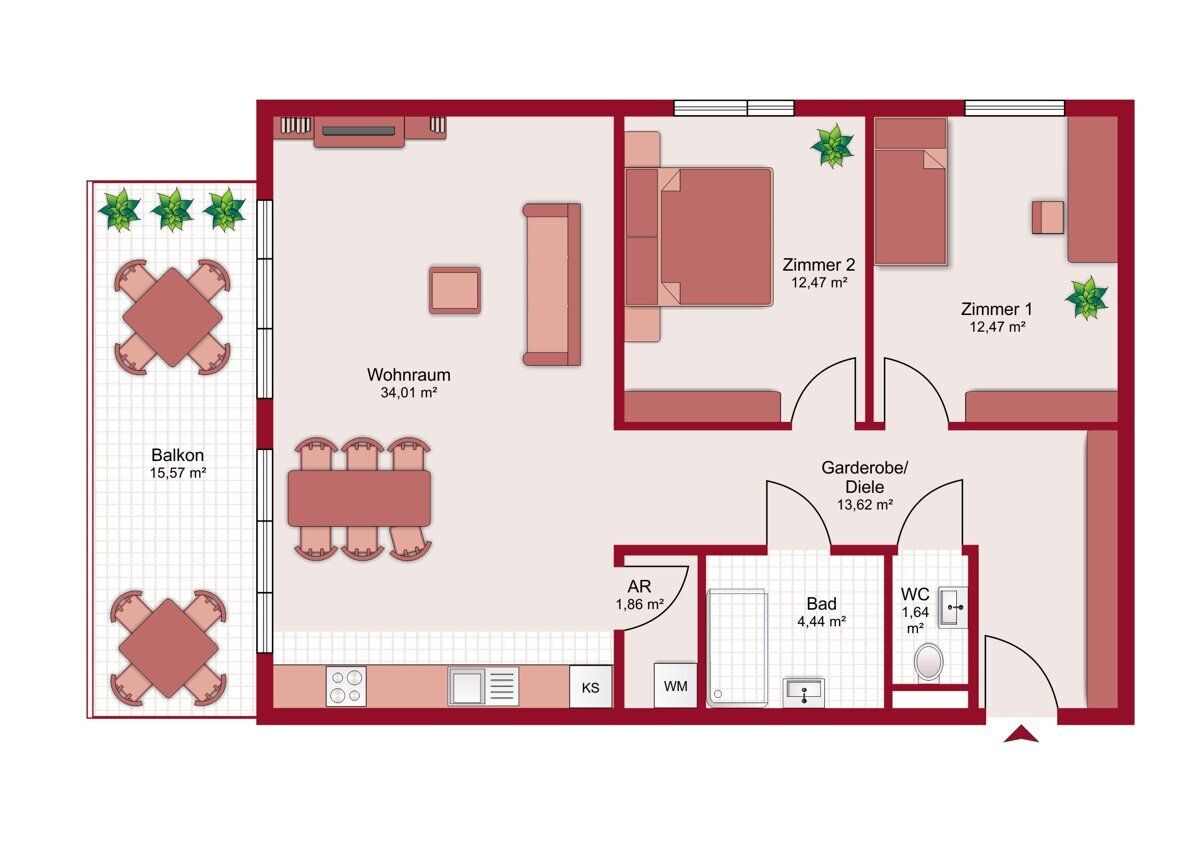 Die Wohnfläche beträgt rund 80 m² und verteilt sich auf drei gut proportionierte Zimmer. Herzstück der Einheit ist der großzügige Wohn- und Essbereich, der durch seine offene Gestaltung viel Raum für unterschiedliche Einrichtungskonzepte bietet. Ergänzt wird das Raumangebot durch zwei identisch geschnittene Schlafzimmer, die sich gleichermaßen als Hauptschlafzimmer, Kinderzimmer, Gästezimmer oder Homeoffice eignen.