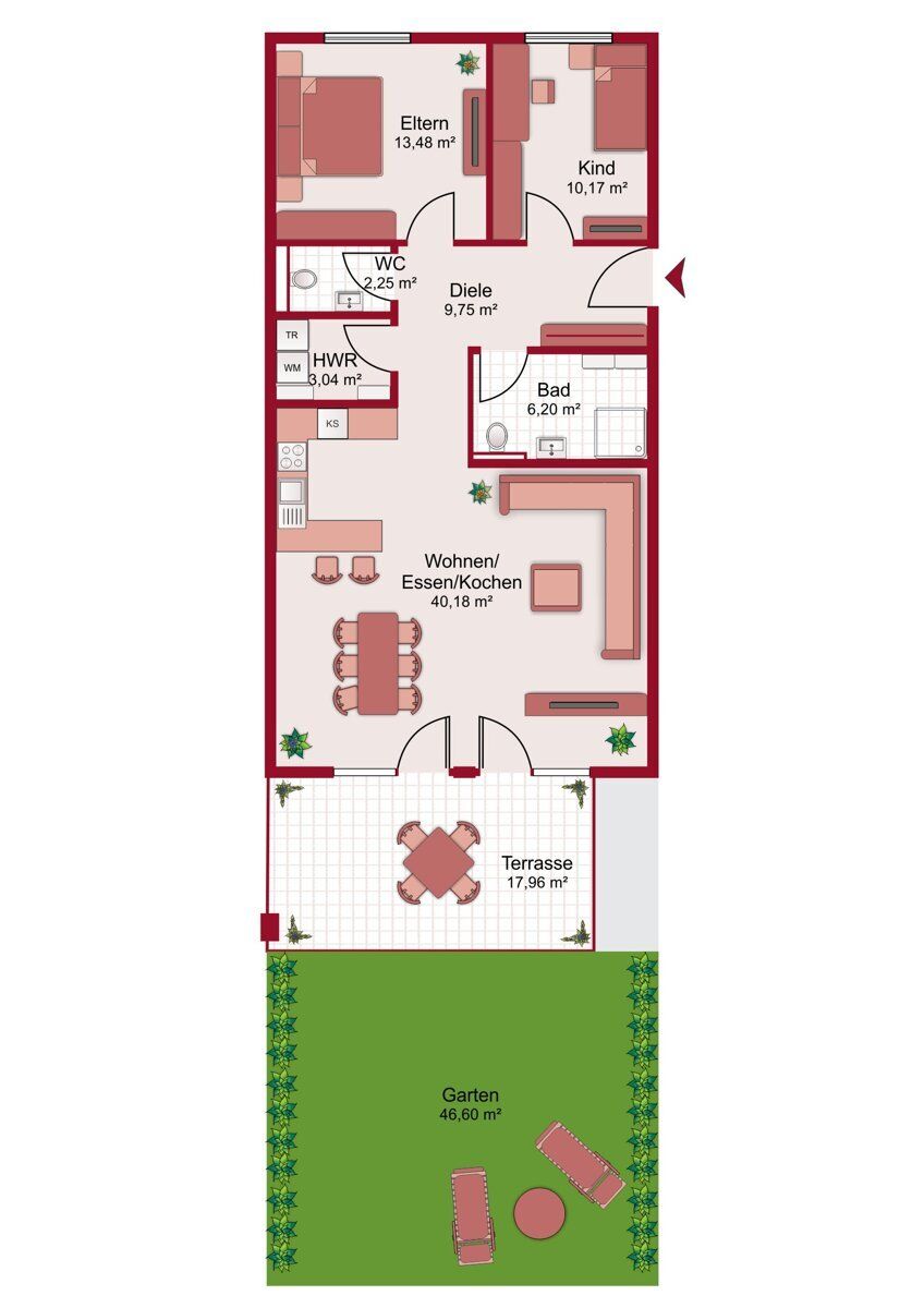 Die Wohnnutzfläche beträgt rund 85 m² und verteilt sich auf drei gut geschnittene Zimmer. Mittelpunkt der Wohnung ist der offen gestaltete Wohn- und Essbereich mit direktem Zugang zur knapp 18 m² großen Terrasse und in den rund 47 m² großen Garten. Die Südwest-Ausrichtung sorgt für eine helle und freundliche Atmosphäre. Zwei weitere Zimmer stehen flexibel als Schlafzimmer, Kinderzimmer, Gästezimmer oder Homeoffice zur Verfügung und ermöglichen eine vielseitige Nutzung.